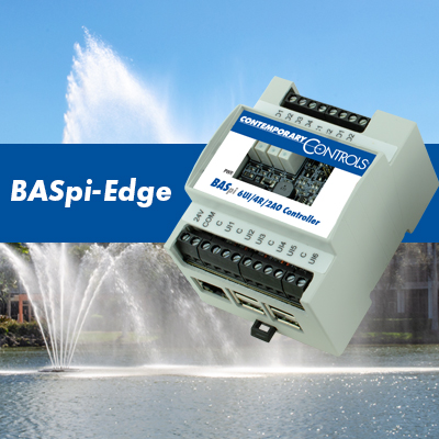 BASpi-Edge是一个12点云连接的BACnet Edge控制器,由树莓派驱动。建筑系统管理员,用三个继电器输出来控制喷泉泵,过滤器泵和灯。分配了两个二进制输入来读取泵的运行状态。其中一个通用输入设置为脉冲输入,连接到水脉冲计,计算一个小时内的补充水,并发送警报,如果它超过正常阈值。当泵的指令与状态不匹配时,系统会发出警报,并向设施人员发送电子邮件通知,以便他们能够主动响应。