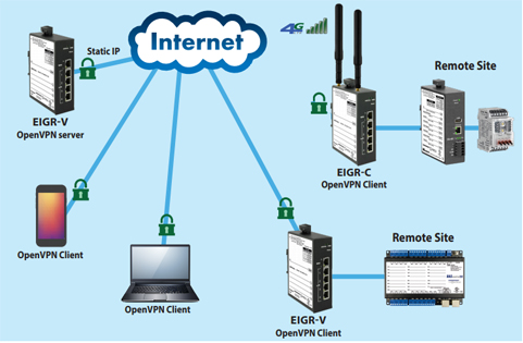 OpenVPN 服务器模式下的一个 EIGR-V 在 OpenVPN 客户端模式客户端中最多可支持 15 个有线/蜂窝 IP 路由器,并且 15 个 OpenVPN 客户端位于 PC/平板电脑/手机上。这些 PC 客户端可以位于具有 Internet 连接的任何地方。通过这种安排,远程位置的 PC/平板电脑/手机客户端和客户端路由器可以使用这个 EIGR-V OpenVPN 服务器的服务与 VPN 客户端路由器后面的设备进行安全通信。另一个好处是每个 PC 客户端都可以配置为与一个或多个相互独立的路由器客户端进行通信。