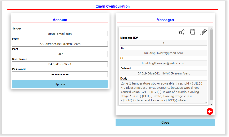 BASpi-Edge 将事件触发的电子邮件发送到任何计算机或手机,让您无论身在何处都可以灵活地接收设施警报。作为持续监控您的楼宇自动化系统的网络连接资产,BASpi-Edge 可以支持由您使用 Sedona 逻辑定义的参数触发的多个电子邮件警报/通知。