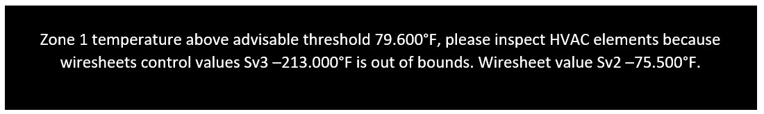 “区域 1 温度高于建议阈值 {{UI1}} °F,请检查 HVAC 元件,因为线路表控制值 SV3={{SV3}} °F 超出范围。线路表值 SV2={SV2}} °F。”