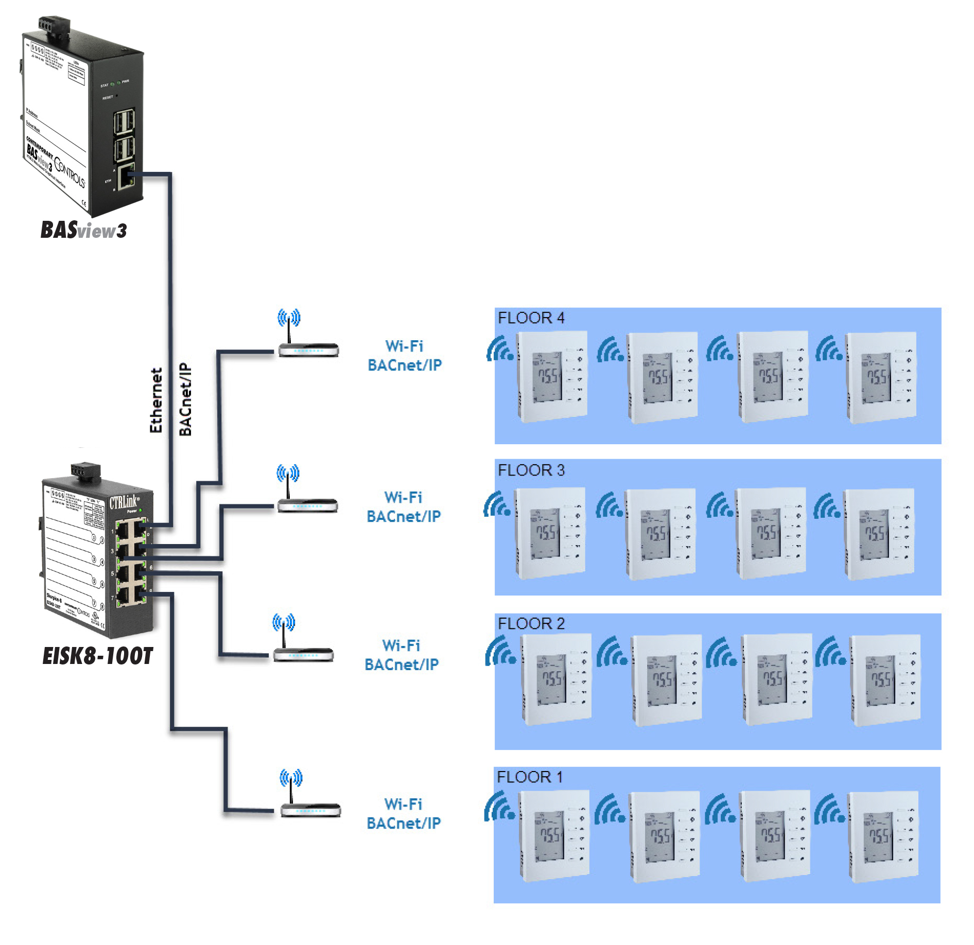 对于使用BACnet/IP通过无线Wi-Fi连接的恒温器连接,BAST-221C-BW2无线恒温器模型是理想的。它是BACnet/IP连接使用无线连接到附近的Wi-Fi路由器/接入点,支持IEEE 802.11b/g/n。