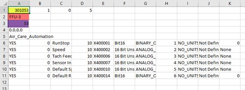 洁净室包含 58 个 FFU,第一个 BASGLX-M1 支持 348 个点,以及 47 个 FFU,第二个 BASGLX-M1 支持 282 个点。科动控制为 FFU 创建了一个设备配置文件,以将 Modbus 数据点映射到 BACnet 对象,并使用每个 FFU 的唯一设备实例、名称和 Modbus 设备 ID 复制 105 次。通过 BASGLX-M1 的虚拟路由,每个 FFU 对 BACnet 头端(Distech - EC-NET 4.10)显示为单独的 BACnet 设备。