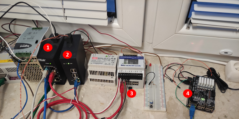 图 1. AGH 科技大学的楼宇自动化实验室配备了科动控制的网络和控制培训设备。 从左到右:1) CTRLink 蝎王型8端口千兆以太网诊断型交换机 2) BASview3 基于Web的图形界面控制器 3) BASpi-Edge 12点云连接BACnet控制器 4) BASpi-IO 12 点树莓派BAS扩展板