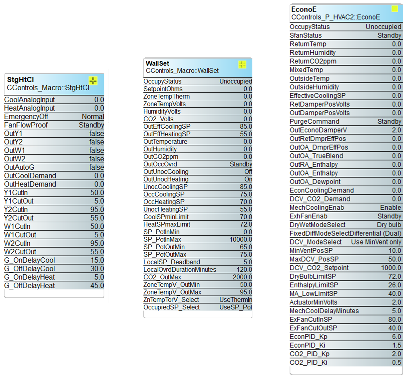 宏组件是高度集成的组件,可减少布线表逻辑存储器的大小和复杂性,从而减少可用的应用程序存储器空间。使用BAScontrol工具集,系统集成商可以将单个复杂组件放到其接线表上,在内部执行更大的互连逻辑块。这降低了程序的复杂性并使其更易于遵循。系统集成商和开发人员还可以使用宏为特定于应用程序的设备创建自定义组件。隐藏逻辑是为了保护专有设计的知识产权。