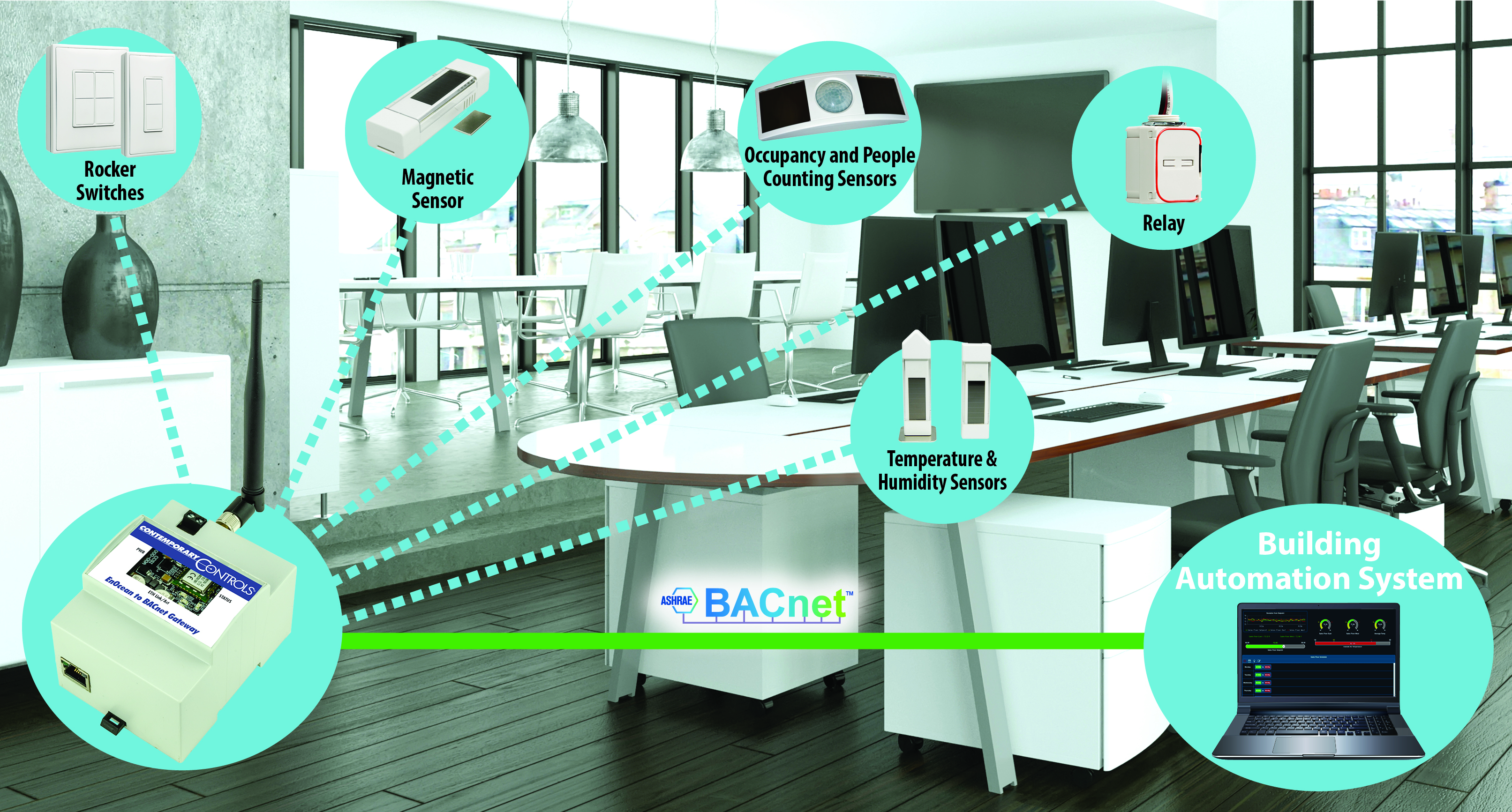 科动控制的 EnOcean 转 BACnet 网关允许 EnOcean 输入和输出设备连接到系统 BACnet 网络中的设备并由其控制。© 现代控制。摇杆开关、磁性传感器、占用和人数计数传感器、继电器以及温度和湿度传感器的单独图像是在EnOcean GmbH ©. 2024 EnOcean GmbH许可下打印的。保留所有权利。