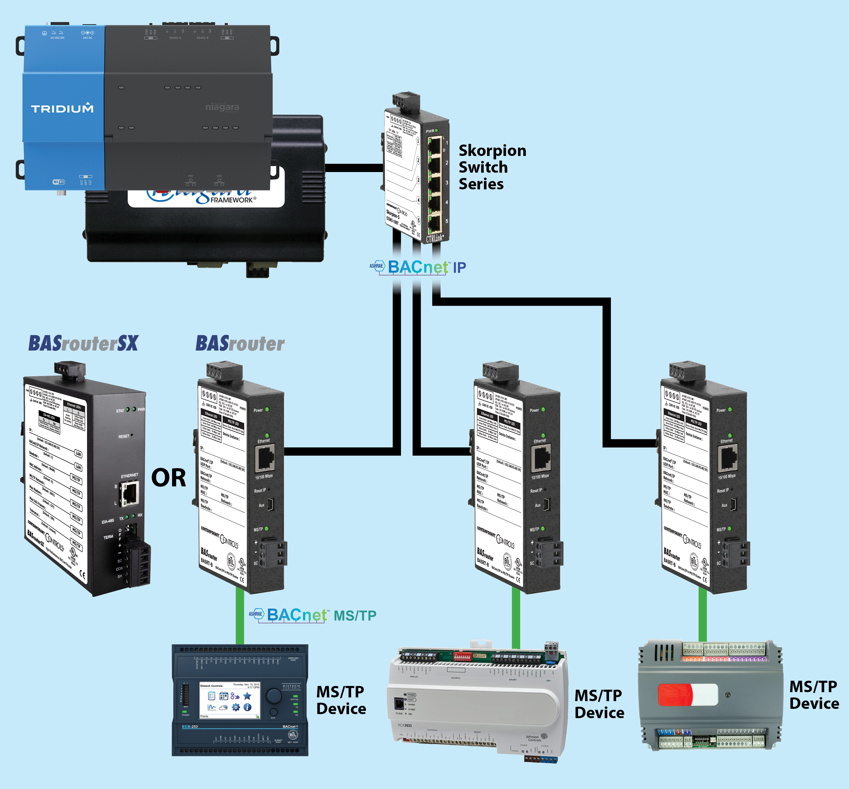 分割 BACnet MS/TP 网络也可以简化 BACnet MS/TP 与 BACnet/IP 的集成。科动控制的 BASrouter 和 BASrouterSX 多网络路由器允许您对 BACnet 网络进行分段,并将流量路由到 BACnet/IP。