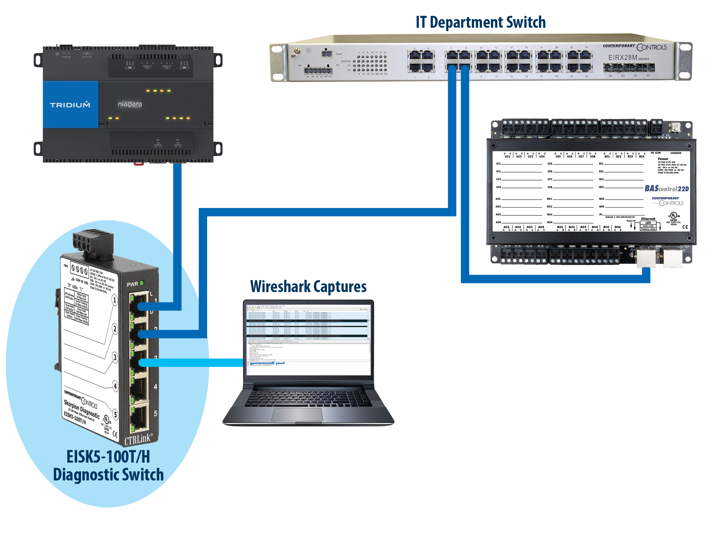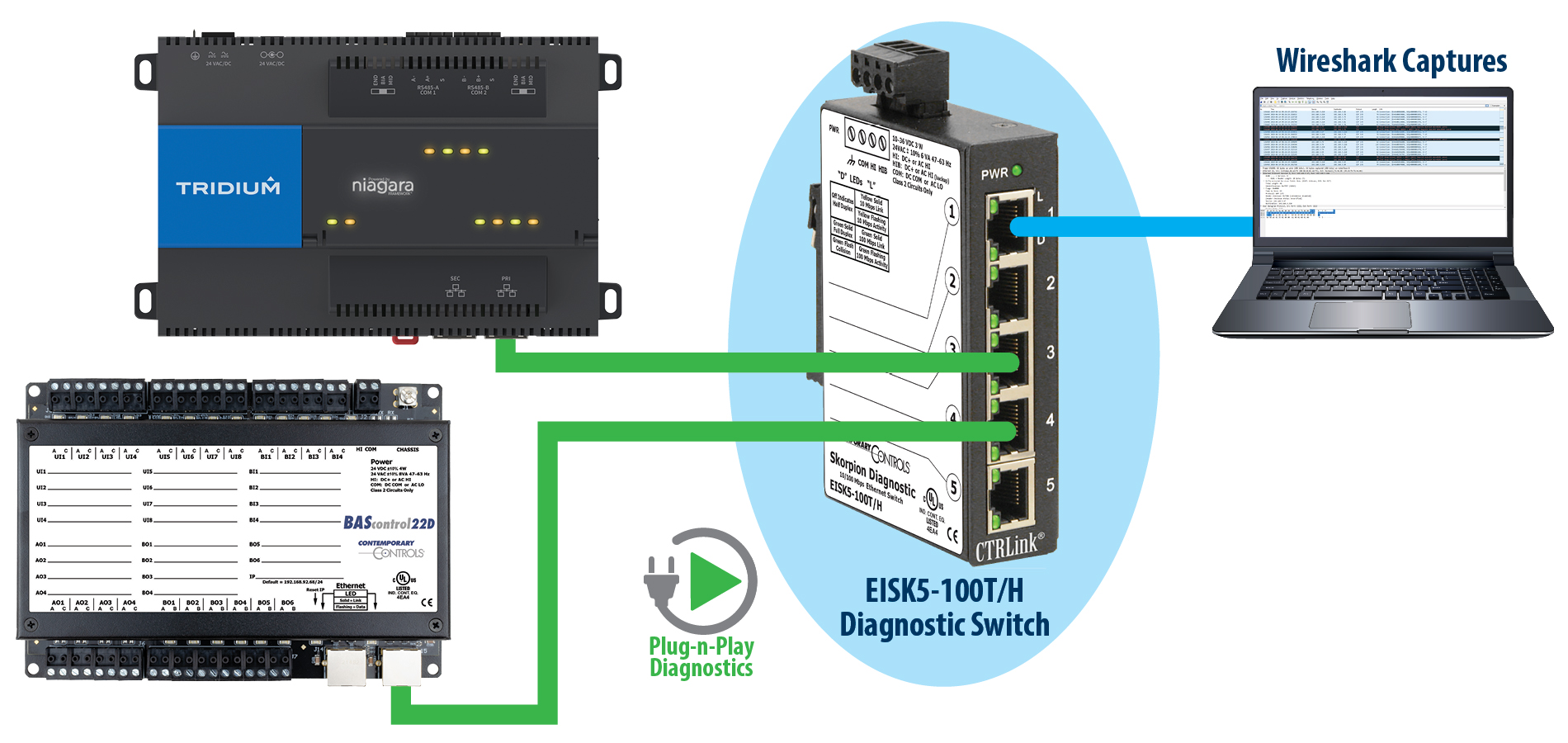 图 1.放置在任何 BACnet/IP 设备与网络其余部分之间的诊断交换机允许您捕获传输或接收的 BACnet/IP 消息。