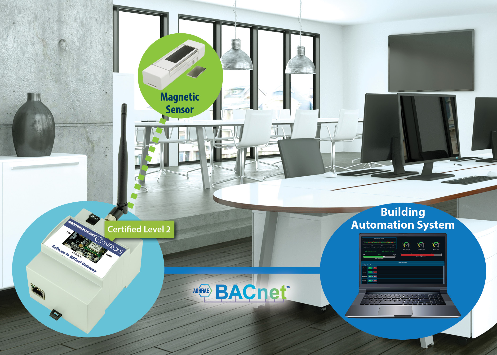 现代窗户监控系统是可持续建筑管理的关键组成部分。通过利用太阳能EnOcean传感器和BACnet网关技术,窗户监控系统为新应用和改造应用提供无缝集成、经济高效的实施和免维护作,而不受传统有线系统的限制。
