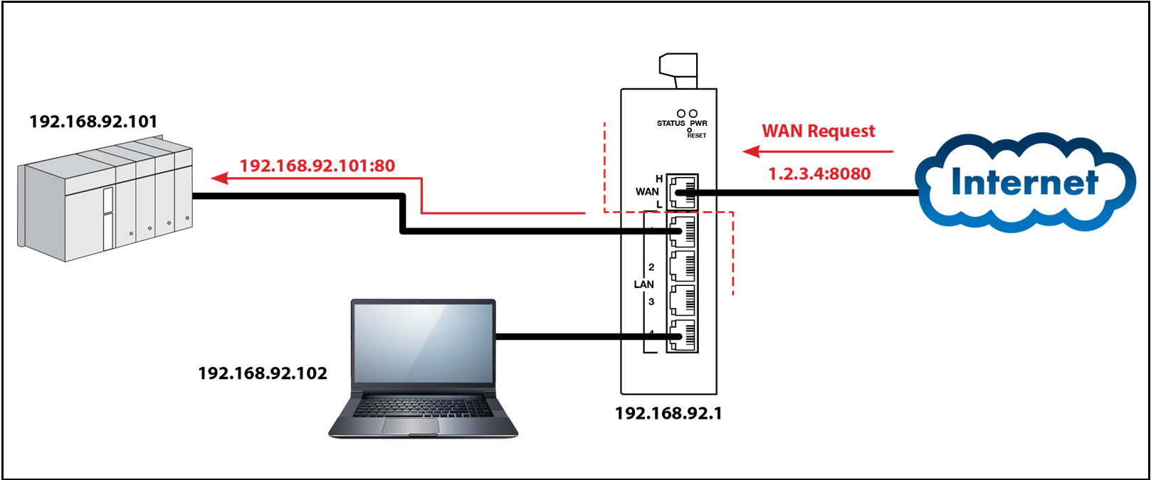 端口转发允许远程设备穿越防火墙并访问专用网络上托管的特定服务或应用程序。通过在路由器或防火墙上配置端口转发设置,对特定端口(例如,HTTP的端口80)的传入请求将定向到网络内的特定设备。此功能通常用于访问网页和应用程序,以配置和编程远程作业现场的设备。
