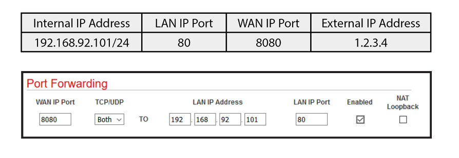 当进行此匹配时,消息将转发到LAN端指定的IP地址。当只有一个公共IP地址可用但需要访问多个LAN端设备时,这非常有用。在此示例中,我们希望访问位于192.168.92.101的专用Web服务器,该服务器通常无法从Internet上看到。使用端口转发,可以向路由器的公共(WAN)地址发出WAN端请求。为了提高安全性,端口号已转换。还可以选择端口范围转发以允许一系列地址通过防火墙。