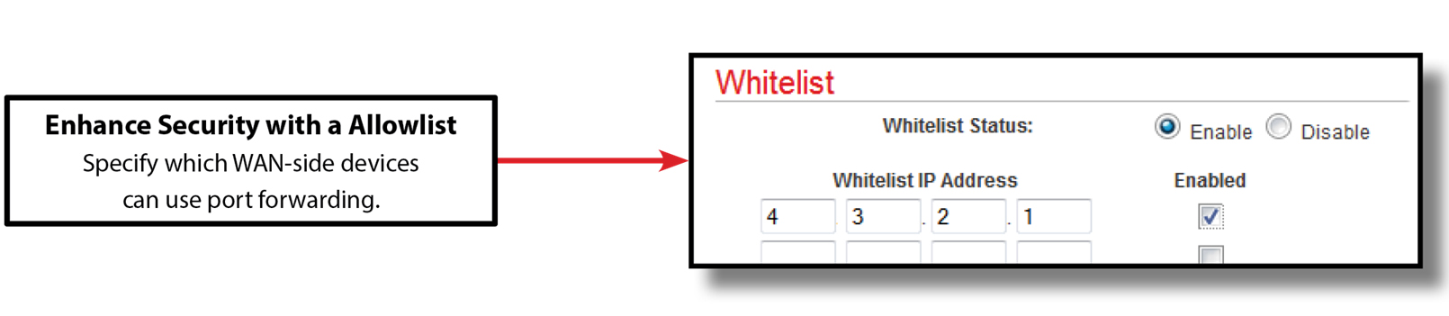 请注意,任何WAN端设备都可以使用端口转发,但您可以通过创建允许的WAN端设备的允许列表来大大增强安全性。