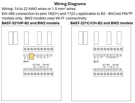 BAST-221C/CH-B2 (有线) 和BW2 (无线): 支持未在恒温器接口上指定O/B (橙色/蓝色) 接线端子的热泵单元。221CH型号包括一个内置的相对湿度 (RH) 传感器。