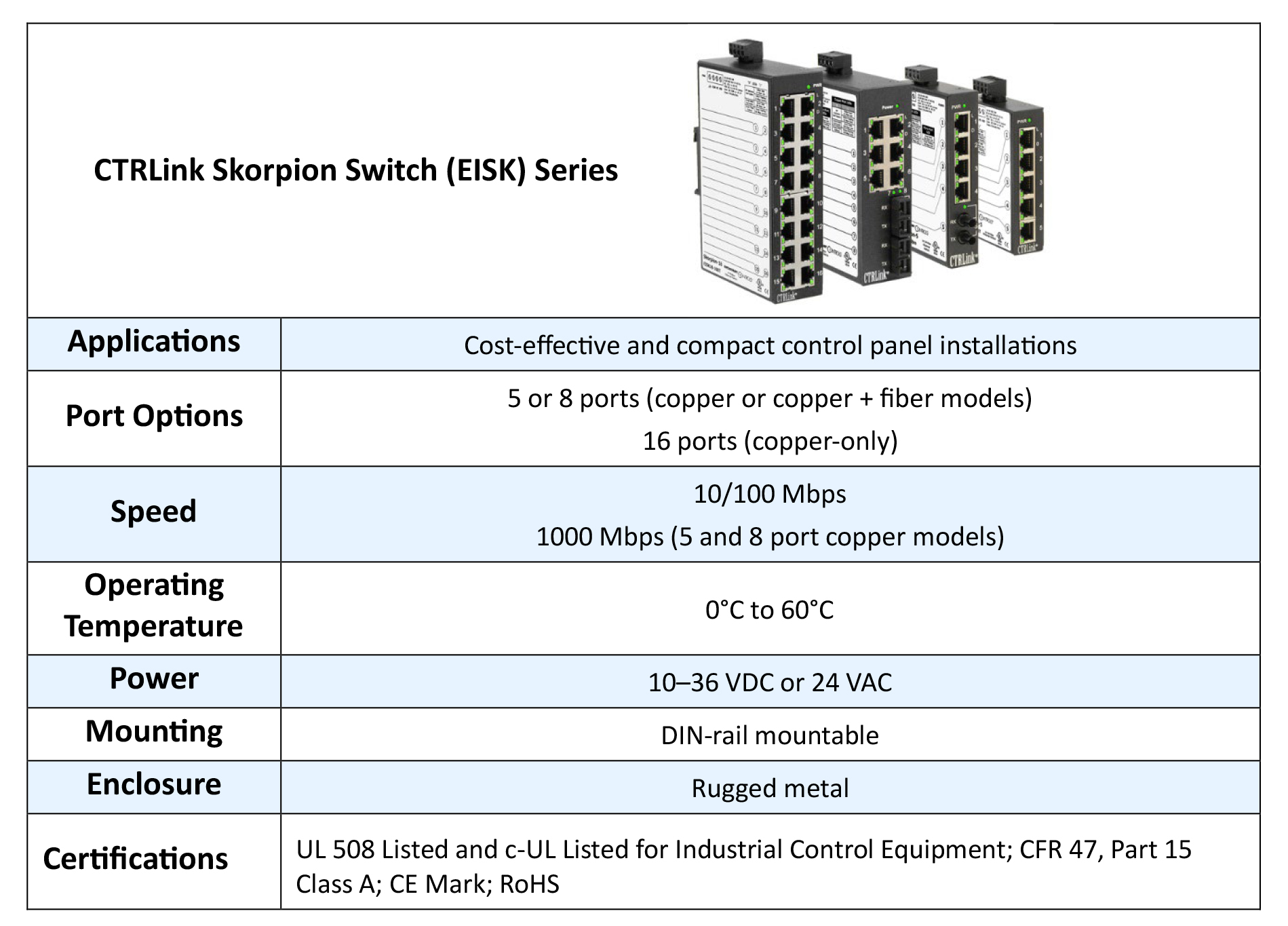 科动控制的CTRLink蝎王型系列工业级以太网交换机专为满足工业和商业自动化控制系统严苛的网络连接需求而设计。蝎王型非网管型交换机易于安装、维护和操作,与办公级设备不同,它们专为需要强大可靠性能、无人值守运行以及符合行业法规的环境而打造。