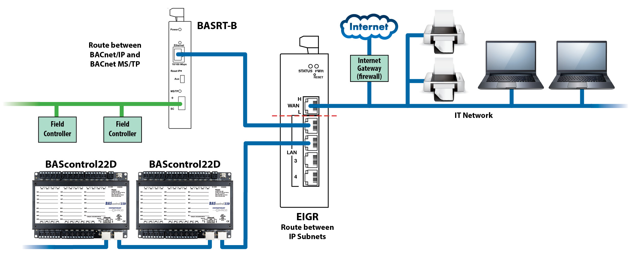 系统集成商在项目现场可能需要增加更多楼宇管理系统(BMS)设备。根据现场的IP配置和IT政策,可用的IP地址可能不足以集成新的BACnet/IP设备。IT部门可能不再愿意为BMS设备提供IP地址支持或分配。此时IT部门可能要求BMS承包商为其设备配置独立网络。此类场景下,可采用科动控制EIGR IP路由器为BMS设备建立独立子网,并将该IP路由器的广域网端口连接至IT网络。